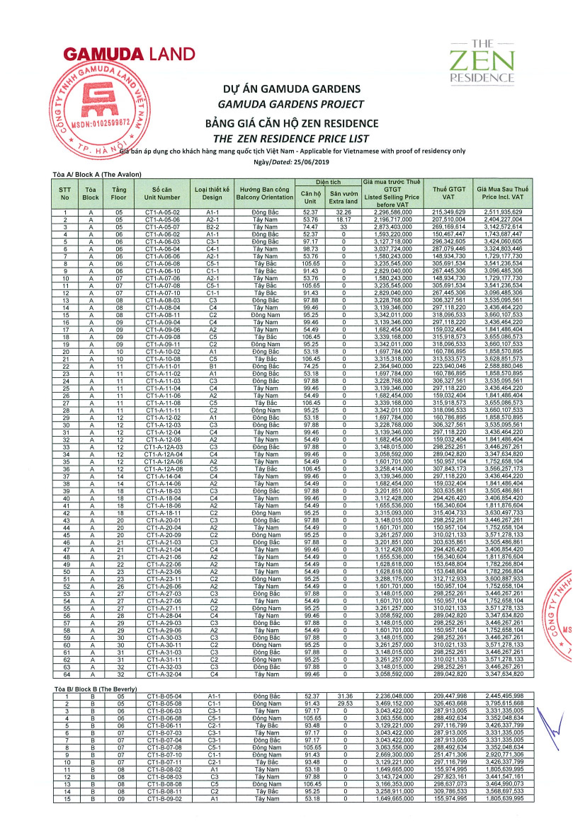 For the unit CT1-A-05-06 we are considering, the local price included VAT is Dong 2,511,935,629. The price of Hong Kong is Dong 3,127,256,544 which is 24.5% more than the local price.