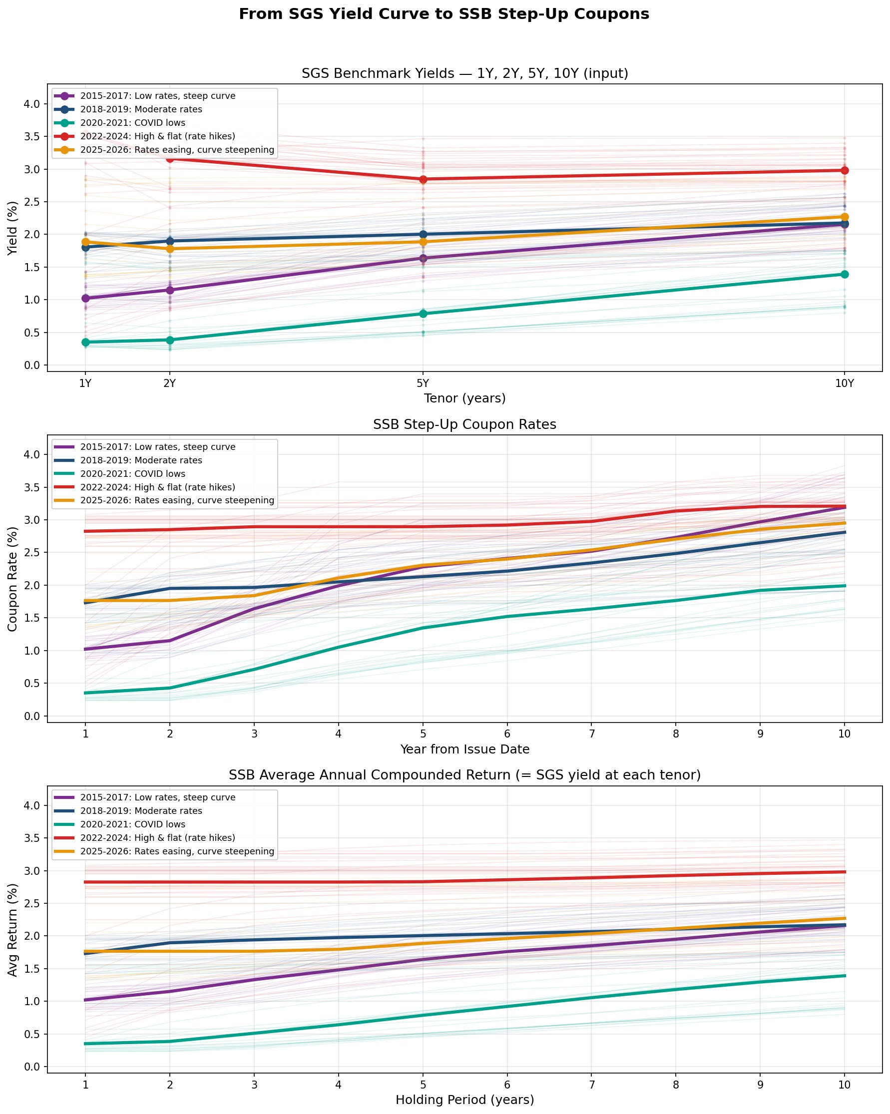 To understand how SSB coupons are derived, it helps to look at the underlying SGS yield curve across different rate environments. The chart below shows three panels: the SGS benchmark yields (input), the resulting SSB coupon rates (output), and the average returns investors actually earn.
