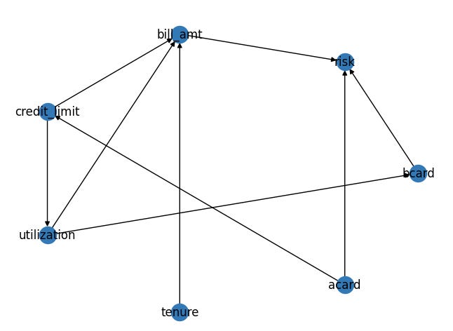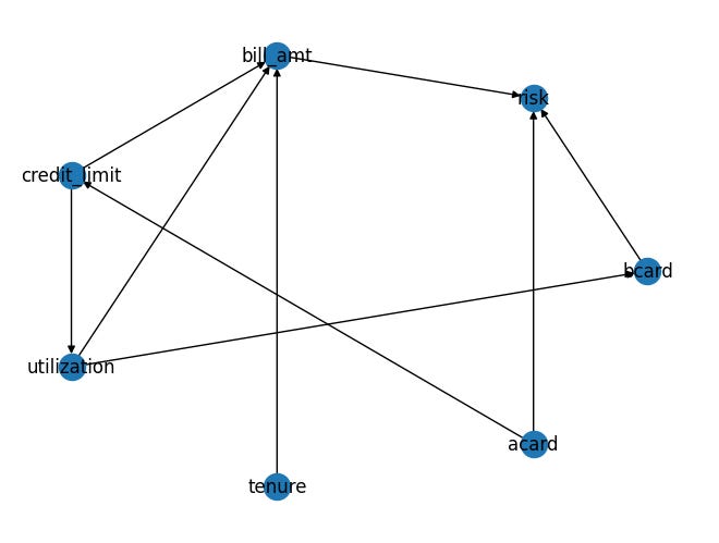 The influence of Acard on both Credit Limit and Risk is pivotal: higher Acard scores often lead to increased credit limits, and conversely, a higher Acard typically indicates lower risk. This makes Acard a key confounder (in the pattern B<--A-->C, A is the confounder). Experienced analysts are adept at controlling for Acard to draw accurate conclusions. However, the addition of more variables can complicate the analysis. Take, for instance, the observation that higher bill amounts correlate with lower risk. Intuitively, one might expect the opposite since a larger bill amount suggests a greater repayment burden, presumably increasing risk. A closer look at the Direct Acyclic Graph (DAG) reveals that the confounding factors here are the interactions between Acard/Credit Limit and Bcard/Utilization. By appropriately adjusting for these confounders, we can uncover positive correlations that align more closely with our intuitive understanding of these relationships.